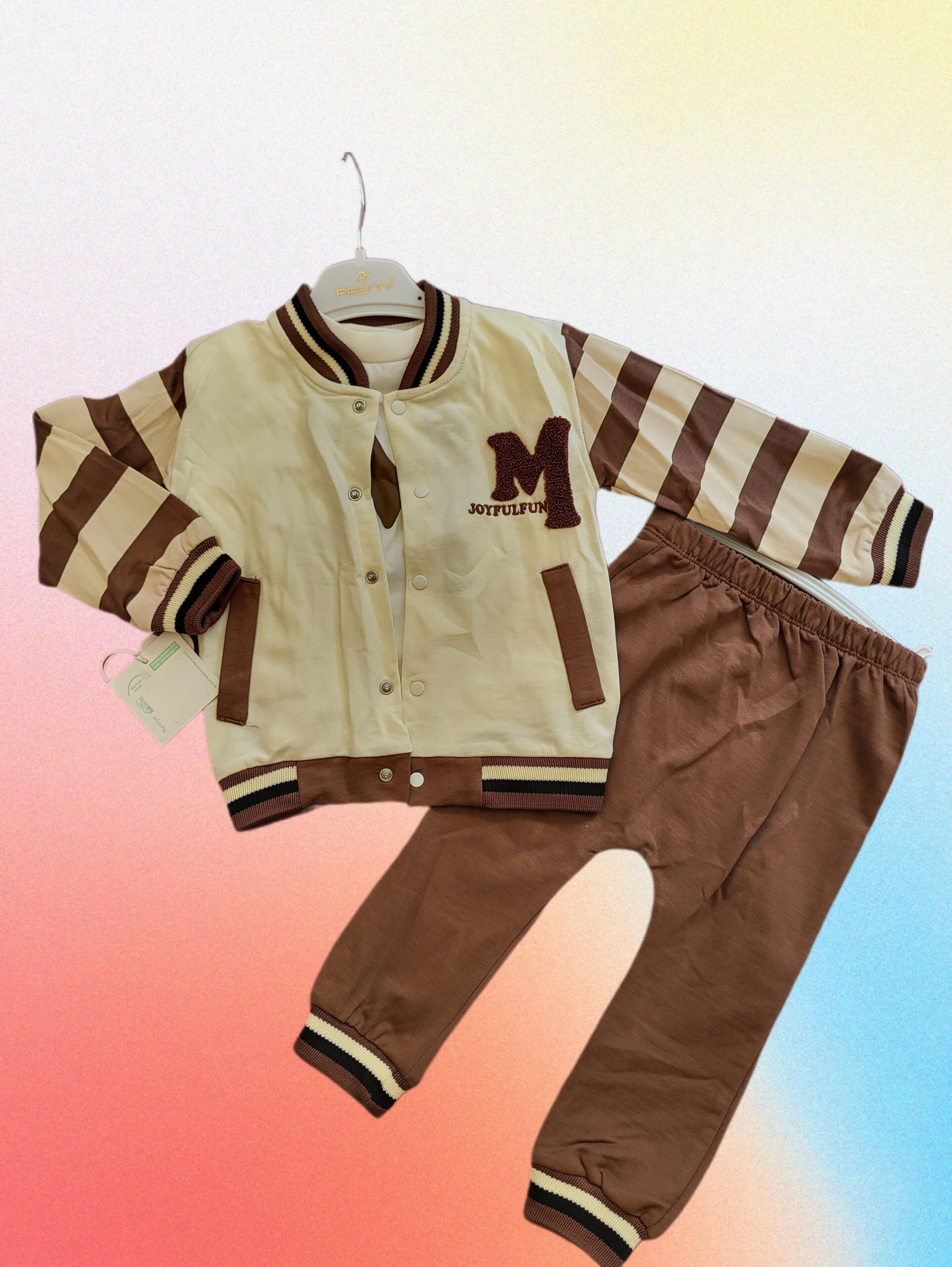 3 dalių komplektukas “M”. Sudaro: palaidinė ilgomis rankovėmis, kelnės, užsegamas megztinis. Spalva: Rūda, balta, šviesiai gelsva.