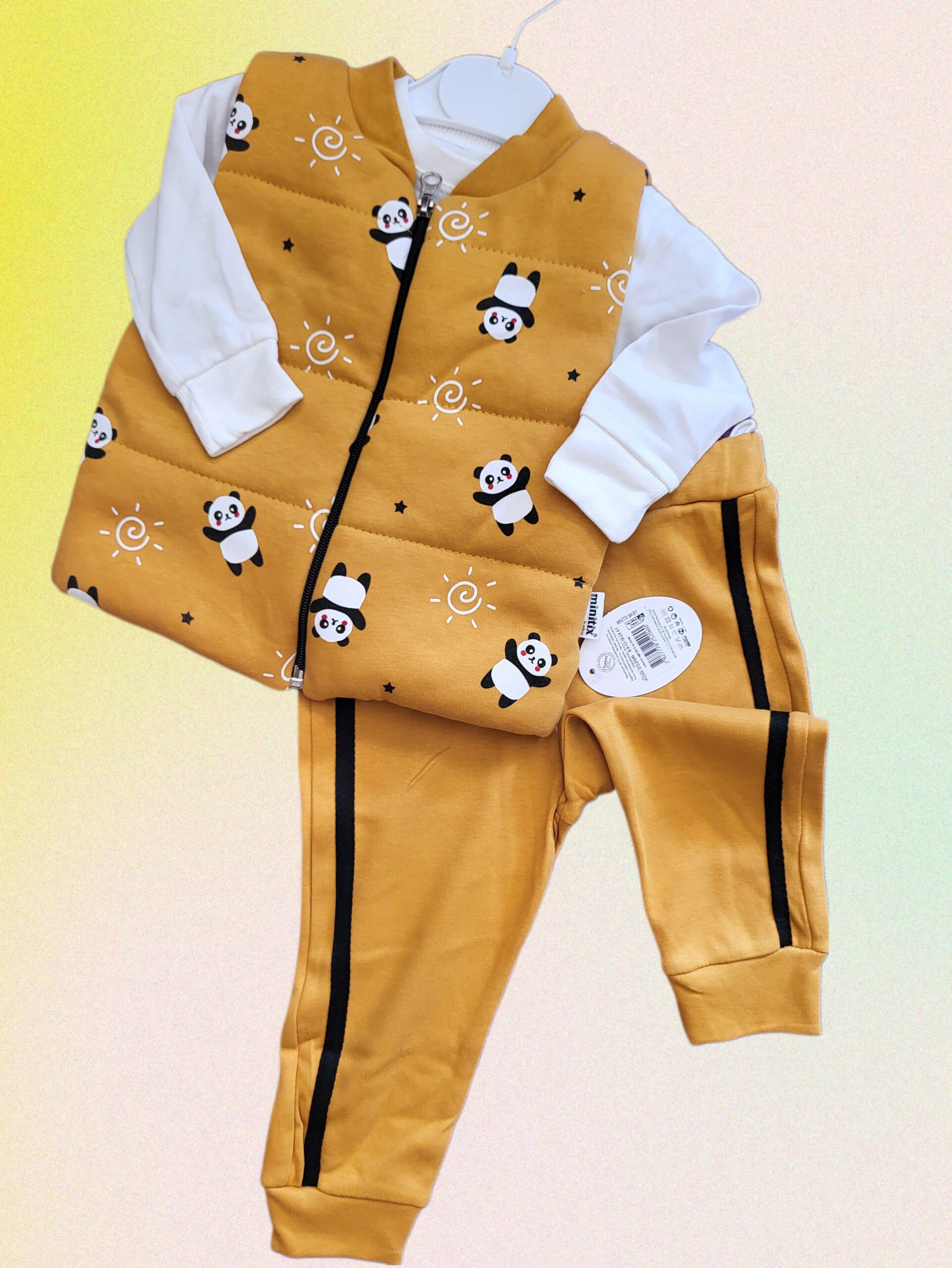 3 dalių komplektas ” Panda “. Megztukas, kelnytės ir liemenė. Megztinis ir kelnės be pašiltinimo, liemenė medžiaginė pašiltinta.