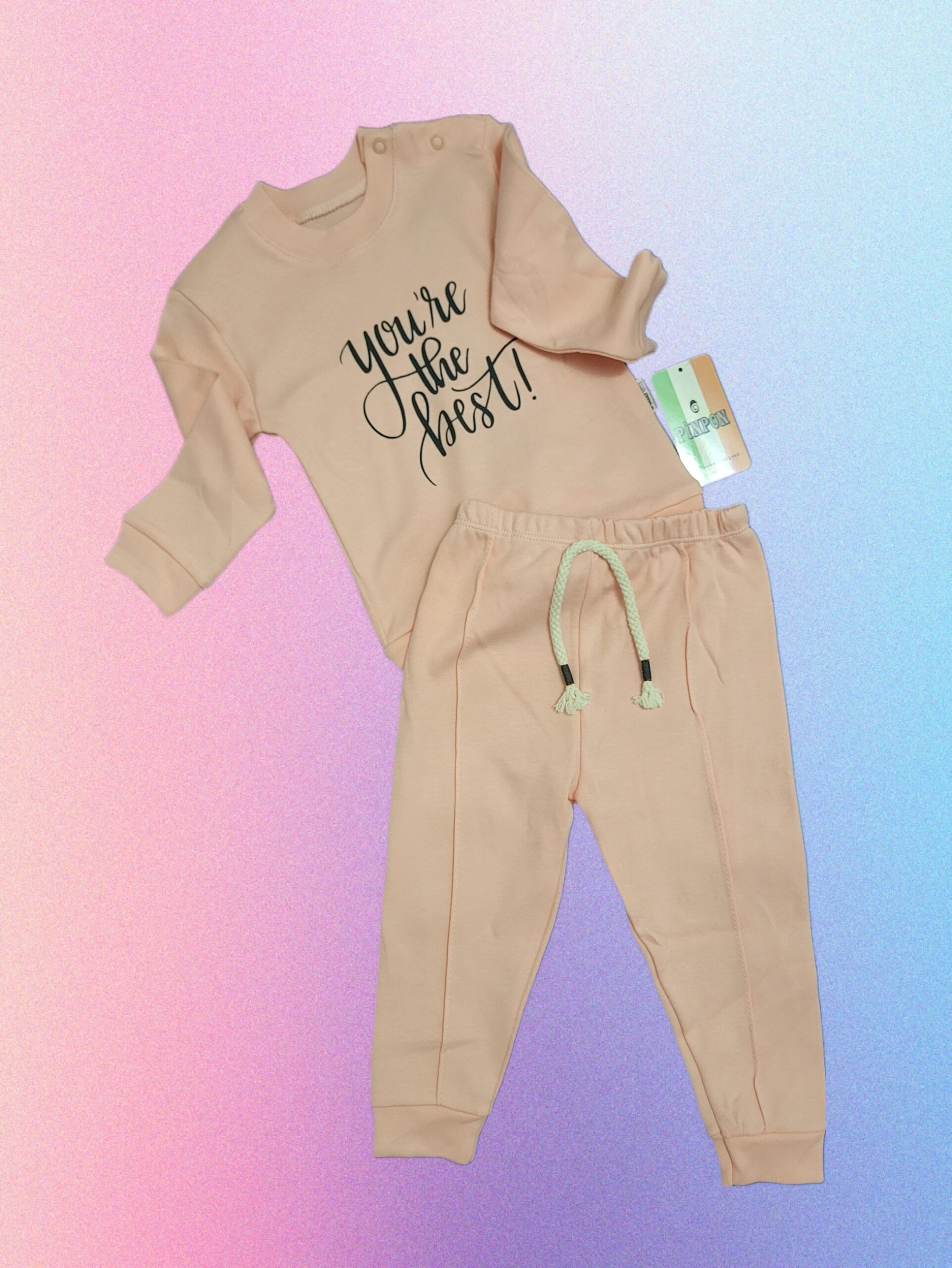 Abrikosų spalvos laisvalaikio komplektas mergaitei. Medžiaga – medvilnė.